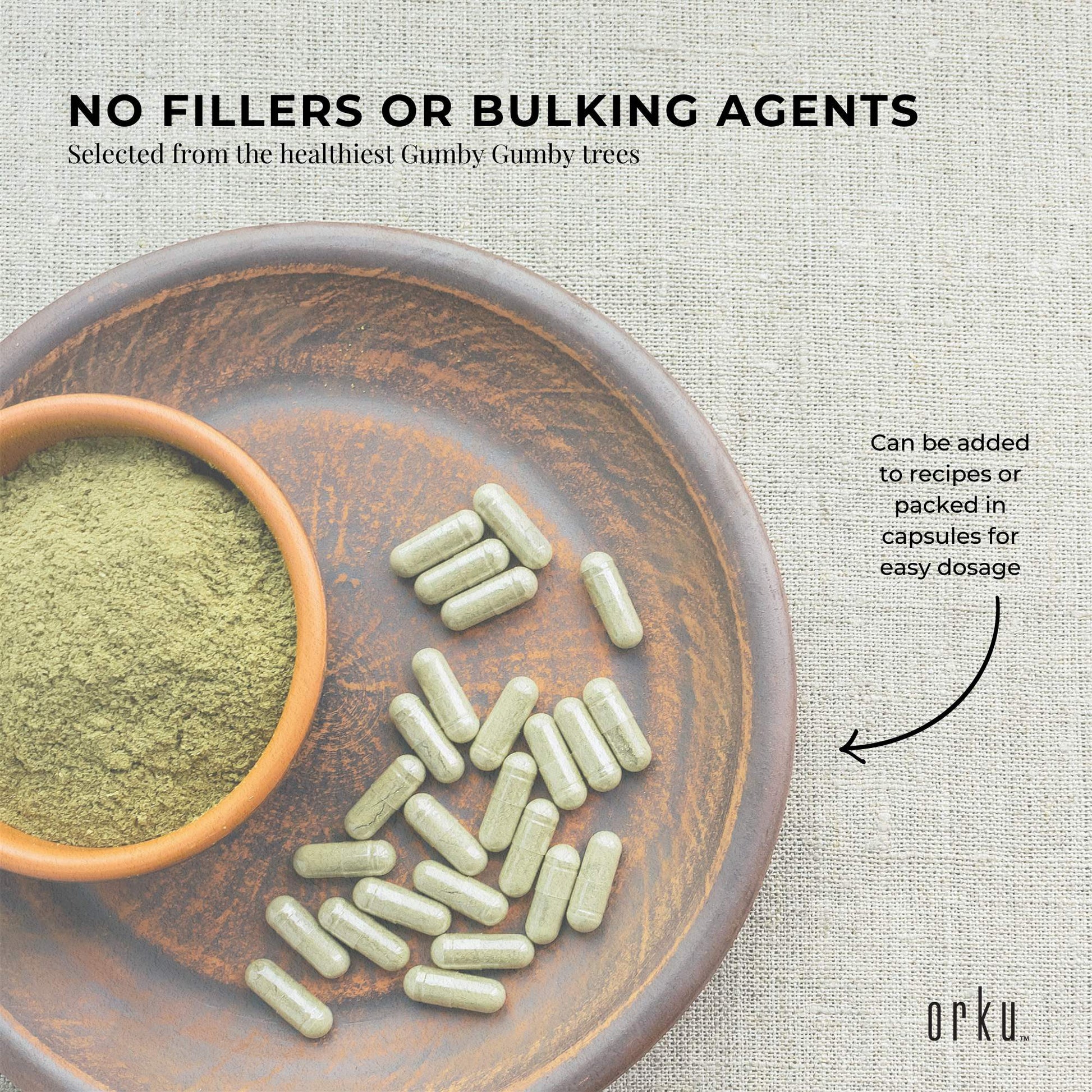 Orku Gumby Gumby (aka GumbyGumby) powder is made from hand selected leaves and green twigs of only the youngest shoots of healthy Gumby Gumby trees.
